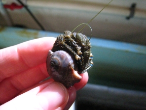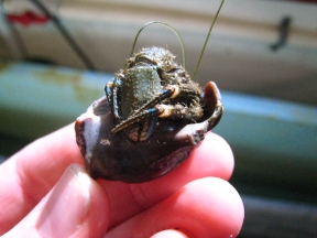 Hairy Hermits are the most common hermit crabs in Puget Sound. Like all hermit crabs, they make their home in abandoned snail shells. A hermit crab's asymmetrical, unprotected abdomen fits easily into spiral snail shells. Hermit crabs won't kill a snail in order to take its shell, but a larger hermit crab may evict a smaller crab and steal its home. The huge right claw is used for protection and gathering food; the smaller left claw is used for eating. Male hermit crabs also sometimes use their left claw to drag females around. (Not sure how a male crab eats during this time, maybe the female feeds him. Anyone?). The male crab will guard the female with his big, he-man right claw until she molts (or sheds her exoskeleton in order to grow bigger), at which point he can fertilize her eggs.