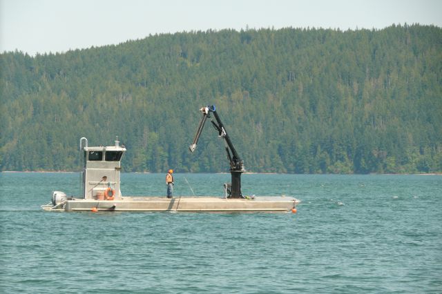 Adam and Miguel head out on the Gladys to pick up oysters and clams at high tide. They use the crane to pick up the oyster tubs. And then take the shellfish to the plant for processing.