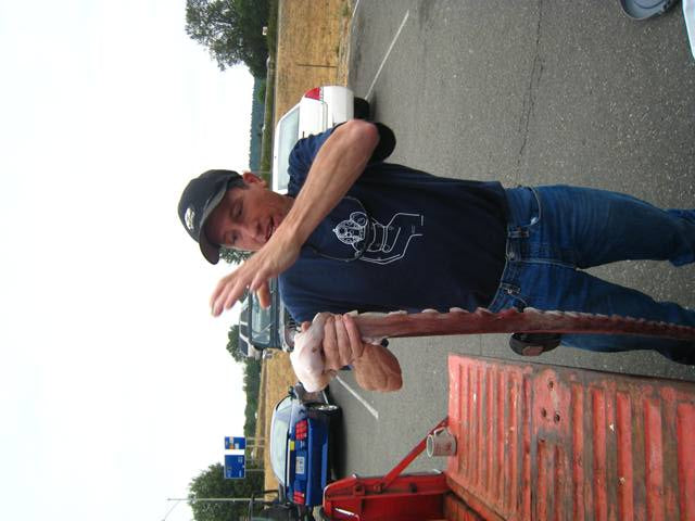 There are two parts to the video... first the octopus swims, and then he changes color. We're not sure, but we think this is a little red octopus. And that's not meant to be sarcastic. There are two species of octopus common in Puget Sound, the North Pacific Giant Octopus and the East Pacific Red Octopus. One way to tell them apart is to look for three eyelash-like papilla below the eyes, which are present in the little red but not in the giant. Unfortunately this octopus wasn't cooperative enough to let us look for eyelashes. But another arrow in our identification quiver is the fact that we hauled it up over the shallow tideflats, and red octopi are shallow-water creatures. Red octopi enjoy a diet of gastropods, bivalves, crabs, and barnacles. Humans occasionally enjoy a diet of octopi. Here's one of our crab suppliers, Ron, holding a tentacle from a giant octopus he pulled up from the depths on a crab pot.
