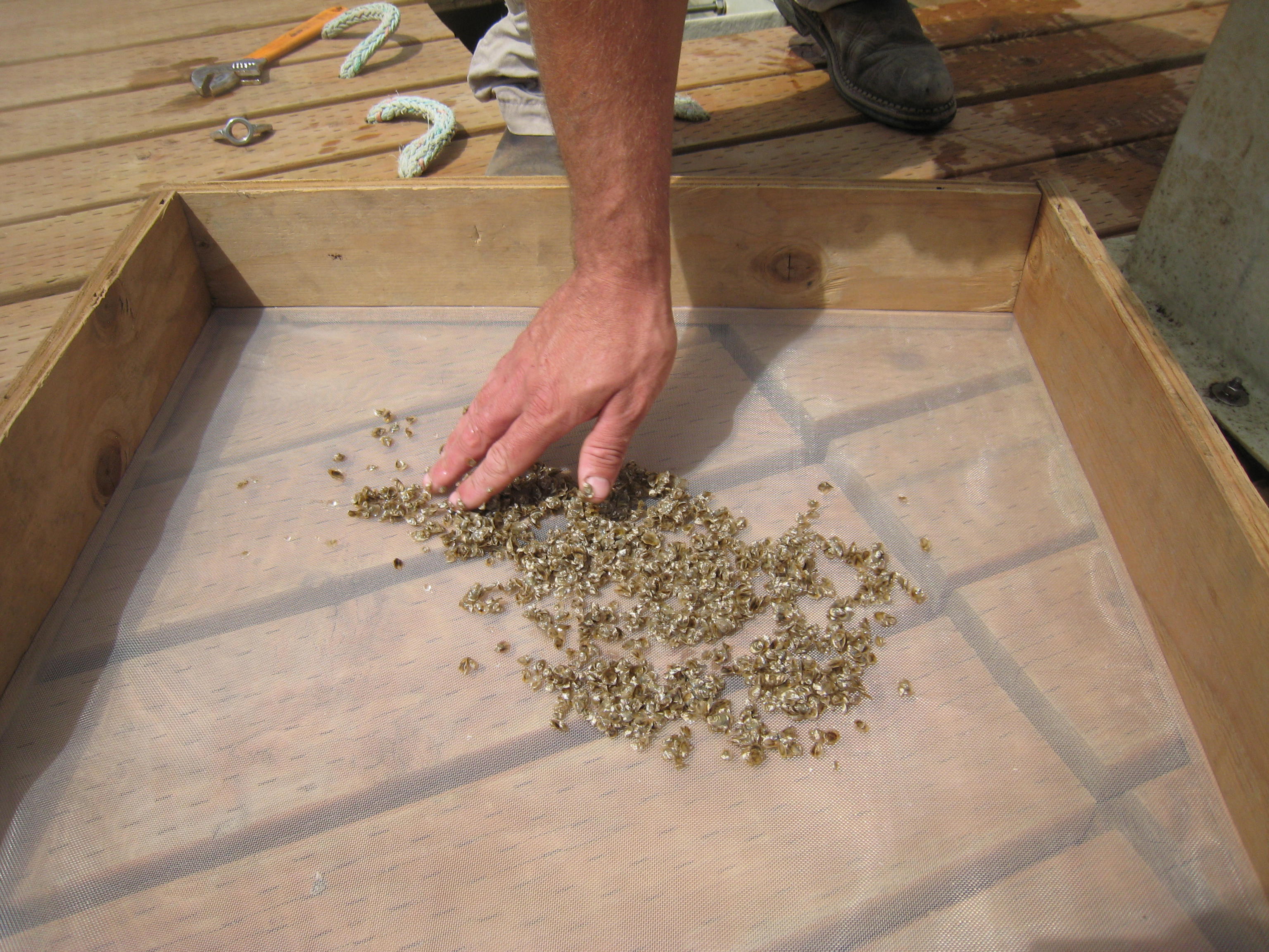 The Flupsy is a shellfish growing machine, and it's doing a great job fattening barnacles and mussels as well as oysters. On the photo day, Nick was busy scraping mussels off the intake screen, and separating barnacles (on right) from the oyster babies: