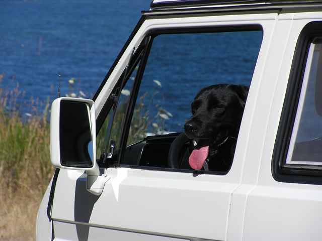 From blog reader Jeff Holt, who, like us, nicknames his vehicles and loves seafood & big dogs. He stopped by the store in July while roadtripping with his Westy "Bandit" and dog Indy.
