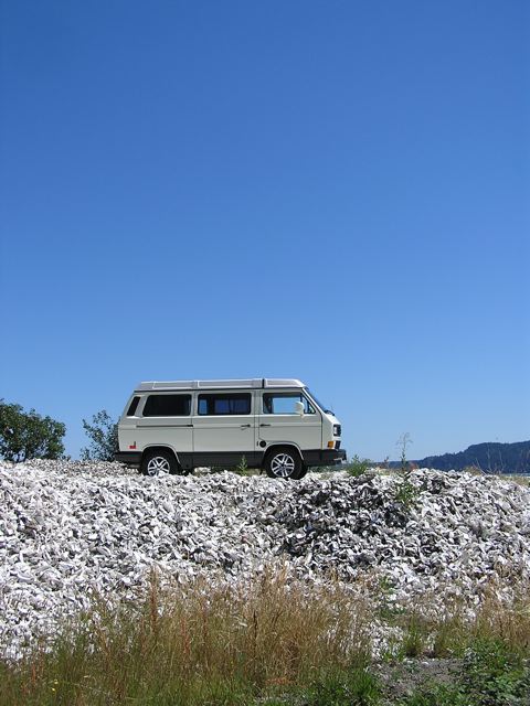 Hi, Last weekend while driving my project '91 Westy around Hood Canal I stopped into your store for the first time and bought some yearling oysters which were great that night. I had such a good time taking in the canal and I love seafood, I drove back to the store on Sunday and bought more oysters, shucked & in the shell, a big crab and some smoked salmon (all gone now). On Sunday I asked the ladies if I could park on your pile of shells to take some pics.