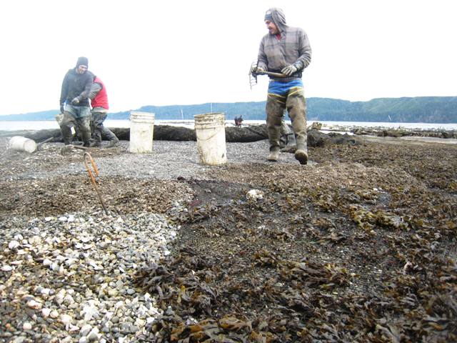 ... accidentally! We've had a few daylight low tides so far this year, and once the sunlight hits the flats the algae starts growing like crazy on our clam nets. Seaweed is algae. And, just in case you might need it, here's an idiot's guide to algae: there's microalgae, which is the kind that oysters eat, and macroalgae, which is the kind that we eat, like kelp, nori, etc. All seaweeds are edible in the sense that they're not toxic, but some are more delicious and digestible than others. Check out this guide to edible seaweed of the Pacific Northwest. Hold off hogging out on seaweed, however, if you're sensitive to iodine. Here we have some fucus, aka bladderwrack or popweed: