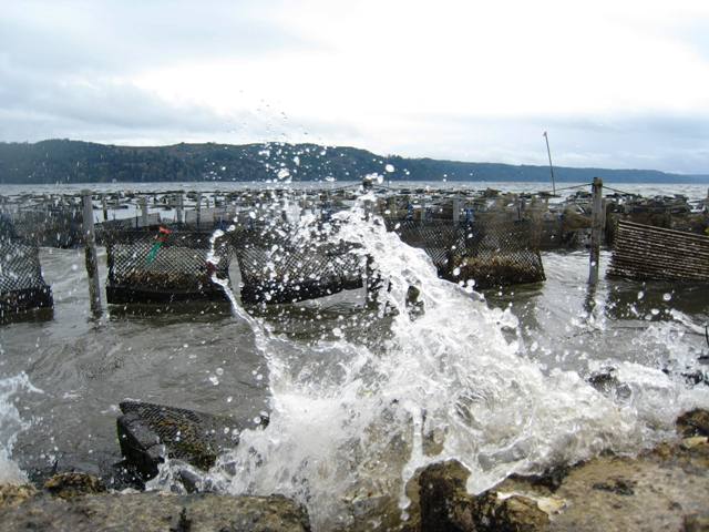 Once the sun comes out for real, all this algae will cook off the nets. And before anybody gets too excited: know that we're not actually farming seaweed (although someday we would like to!), this stuff just grows on our gear. Nor are we harvesting it commercially... because that would be illegal. In Washington State you can harvest seaweed to eat at home (read the rules here) but you can't harvest it to sell. Obviously, it's a very important part of the food chain, and even macroalgae will break down into little bits, becoming micro, and therefore shellfish food. Studies have shown that blue mussels on the coast eat lots and lots of tiny kelp particles. Yesterday was a rough day... and when you work on an oyster farm, that expression is literal: the wind made things rough. It was the kind of day that turns macroalgae into microalgae. Here's a photo of the waves beating up some blue pools in the tumble farm on the incoming tide:
