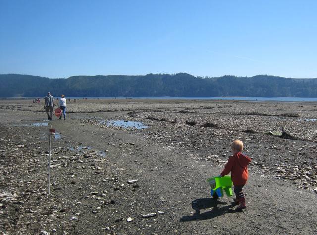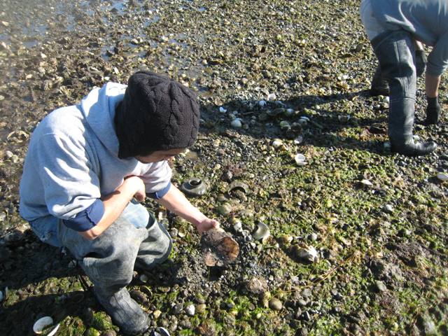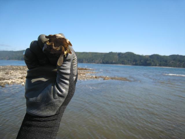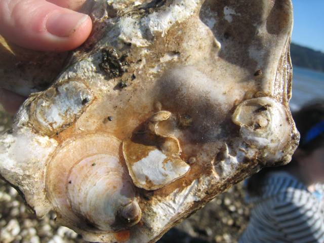In the wet, deep areas we found wild olympia oysters clinging to pacific shells: