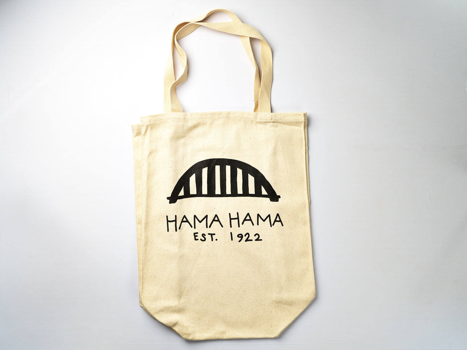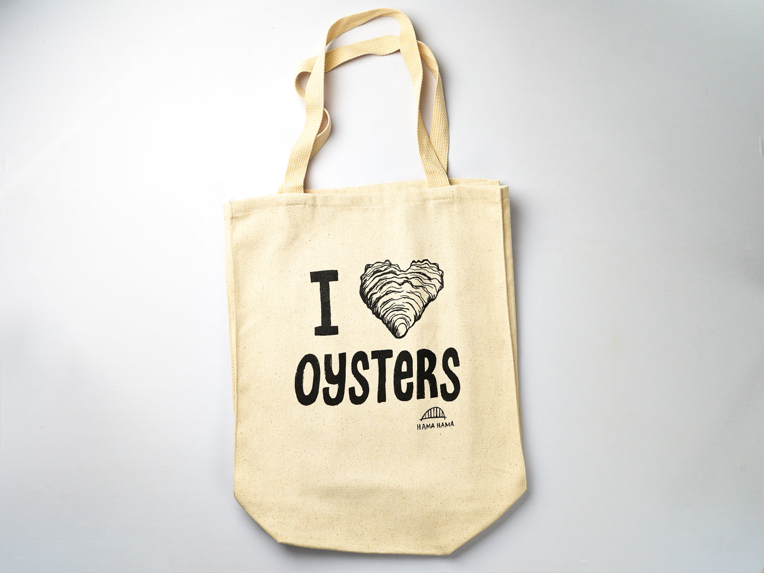 Canvas tote bags printed by Black Star Ink in Shelton, WA, printed with custom designs drawn for us by Kelsey Wickwire (hand drawn bridge) and Emi Matsumoto (I Heart Oysters).
