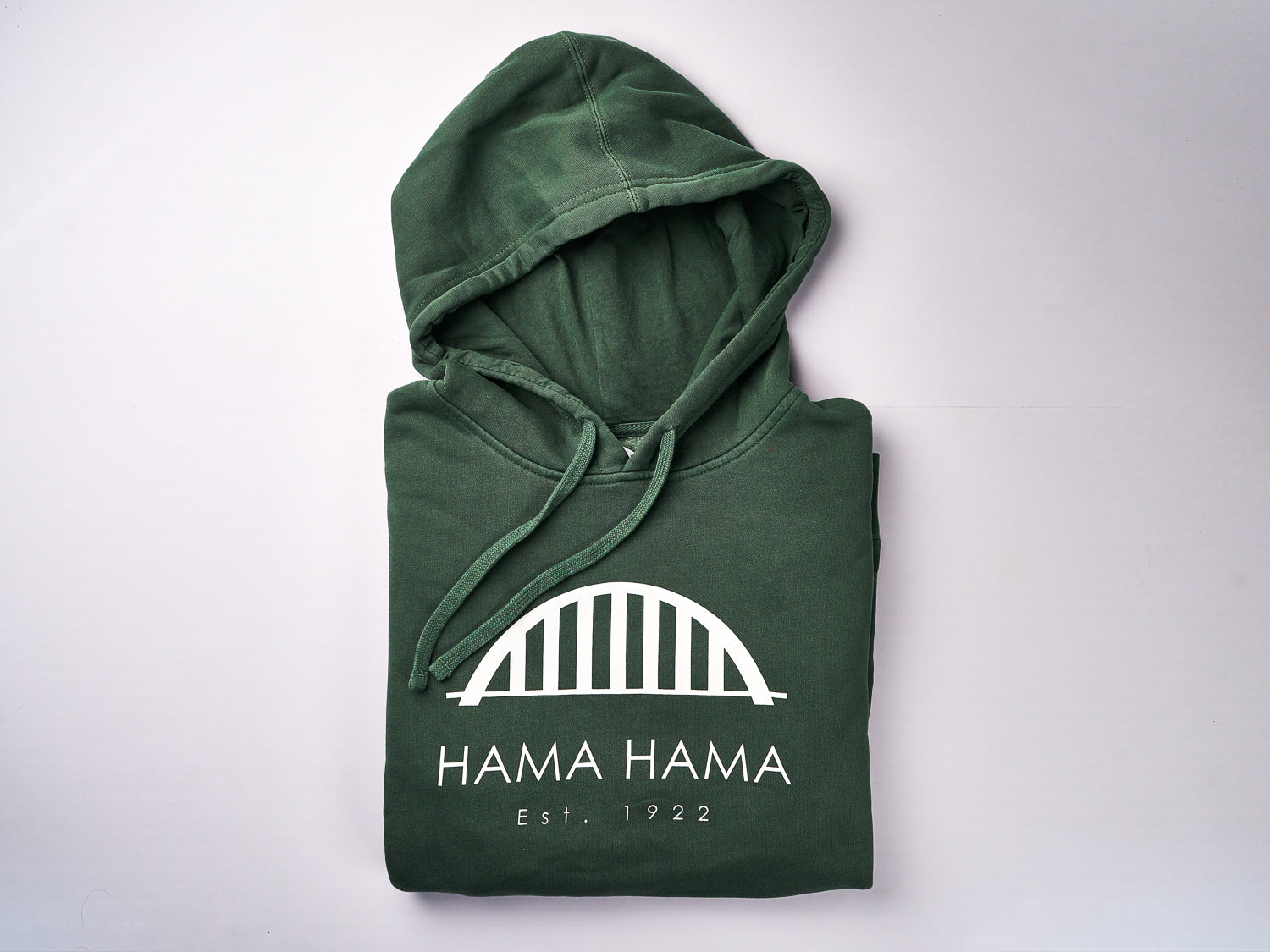 This is a midweight pigment-dyed pullover hoodie with a white bridge logo.