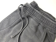 Gray pigment-dyed drawstring sweatpants with the bridge on the left leg.