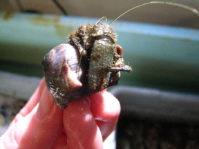 Hairy Hermits are the most common hermit crabs in Puget Sound. Like all hermit crabs, they make their home in abandoned snail shells. A hermit crab's asymmetrical, unprotected abdomen fits easily into spiral snail shells. Hermit crabs won't kill a snail in order to take its shell, but a larger hermit crab may evict a smaller crab and steal its home. The huge right claw is used for protection and gathering food; the smaller left claw is used for eating. Male hermit crabs also sometimes use their left claw to drag females around. (Not sure how a male crab eats during this time, maybe the female feeds him. Anyone?). The male crab will guard the female with his big, he-man right claw until she molts (or sheds her exoskeleton in order to grow bigger), at which point he can fertilize her eggs.