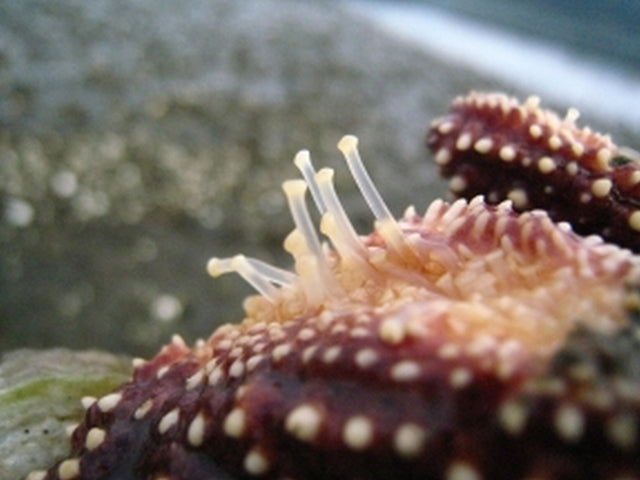 Tube feet, above, are part of a sea star's water vascular system. The star contracts a muscle to force water into the tube foot, causing the foot to expand and push against the ground. When the sea star relaxes the muscle, the water flows out of the tube foot and the foot retracts. Each foot ends in a tiny, and extraordinarily sticky, suction cup. We hope that sea stars are able to turn the stickiness on and off, otherwise this guy is going to be lugging these rocks around for quite a while.