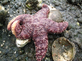 Sea stars, the echinoderms formerly known as starfish, have neither brains nor blood. Their circulatory system uses filtered sea water, and their central nervous system is spread out among the rays, or legs, which scientists believe communicate sensory information to each other whenever the starfish... whoops, sea star, decides to move or eat. Severed sea star rays normally grow back, and a tropical species known as Linckia can regenerate an entire sea star from a single ray. Some sea stars, like the one above, are predators that feed on mussels, clams, and oysters. The stars first pry the bivalves open, and then evert their stomach into the opened shell to digest the meat. Naturally, sea stars aren't as popular with oyster farmers as they are with 6-year old beach combers.