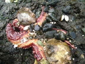 […] Starfish are voracious oyster eaters, and this one is particularly greedy. They use their hydraulic tube feet to pull the oyster apart, then they evert their stomach and digest the oyster remotely. Read about it here. […]