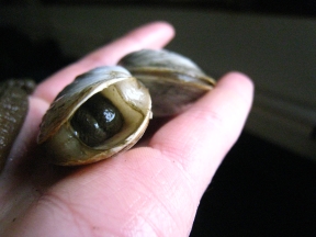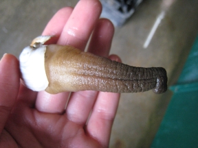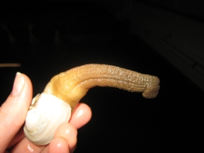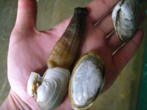 One geoduck with broken shell, two horseclams.