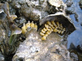 Mystery solved! And it wasn't actually that great a mystery. The egg cases below were laid by a drill snail, a voracious oyster predator.