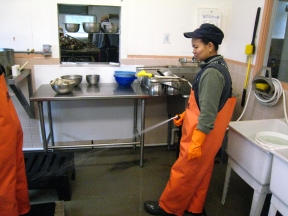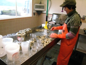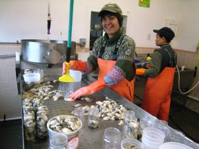 Packers Teresa and Brenda put the oysters through a bubbler and then rinse and sort the oysters according to size. Oysters that are shucked badly are set aside to be packed as cuts, which we sell for a ridiculously low price. (And no, you can't place an order for cuts... we don't do them on purpose!)