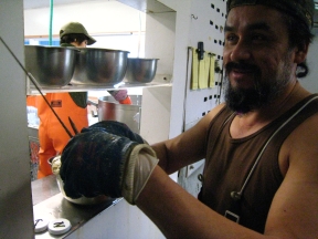 When the shuckers shuck enough oysters to fill a bowl, they send the bowl through the window into the packing/grading room.