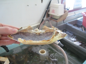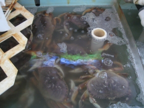 We were fiinally able to get our crab pot out on Frenchman’s Cove on Thursday. A tempting turkey leg for bait garnered 9 crab over a 5 hour period. 3 females, 3 too small and 3 keepers. We cooked them up and then put them on ice for 24 hours. Together with sweet white corn and a thick medium trare New York strip, we had a great surf and turf dinner watching the waves roll into the cove on stout south wind. Living the dream!
