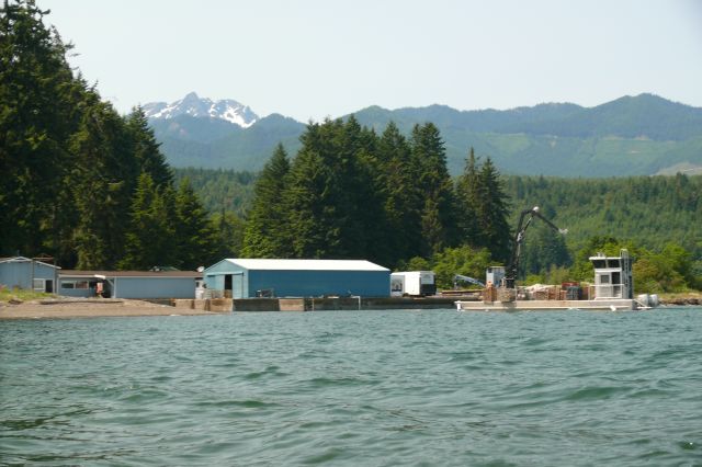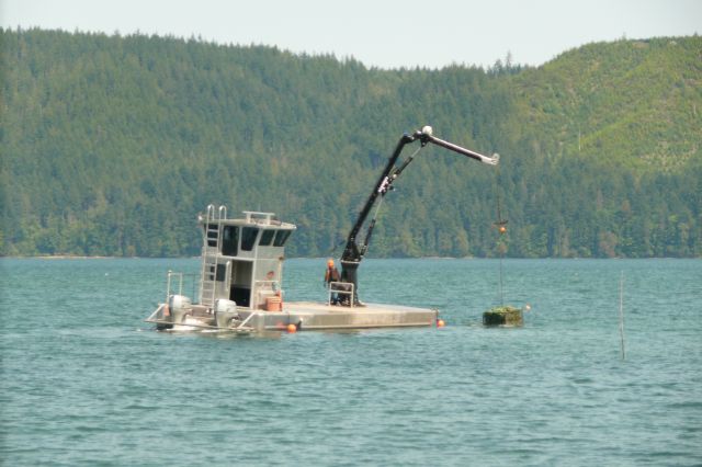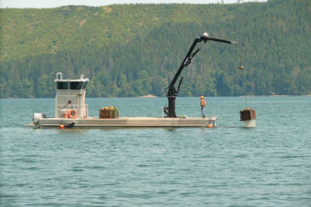 Adam and Miguel head out on the Gladys to pick up oysters and clams at high tide. They use the crane to pick up the oyster tubs. And then take the shellfish to the plant for processing.