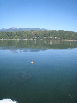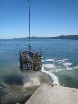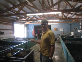 The barge goes out at high tide and picks up full tubs of oysters. Look closely at the picture below and you'll see an oyster tub sitting on the tideflats.