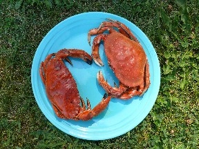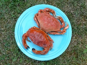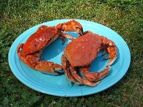 The Pacific red rock crab (Cancer productus) lives in the shadow of the more popular Dungeness crab (C. magister). Really, who's ever heard of a rock crab??? Here, they confront one another. Which one is the rock? The one with the black fingernails.