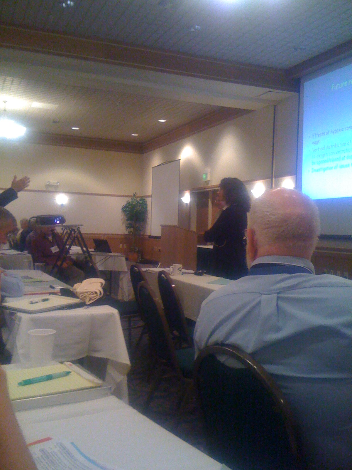 (apologies for the cell phone pictures). The conference started out with a bang on Wednesday morning with a talk about ocean acidification by Dr. Richard Feely of NOAA and the University of Washington. Here's a brief, and dirty, description of the problem: Scientists have long known that the ocean absorbs carbon dioxide... and for a while they thought that was a good thing because it removed co2 from the atmosphere. But now they know that the extra co2 is actually making the oceans more acidic. As that happens, we can expect most sea plants (which use co2) to flourish, and creatures like snails, coral, oysters, and plankton to suffer. And guess what? Off the Washington and Oregon coasts scientists are already seeing pH levels low enough to prevent sea creatures from forming shells. If you're feeling motivated to help save the defenseless copepods, you could write to your Senator and tell him/her to support the FOARAM Act, Senate Bill 1581, which would create an agency within NOAA specifically devoted to oceanic acidification research. The act passed the House but has been swimming around the Senate since 2007, hopefully without dissolving.