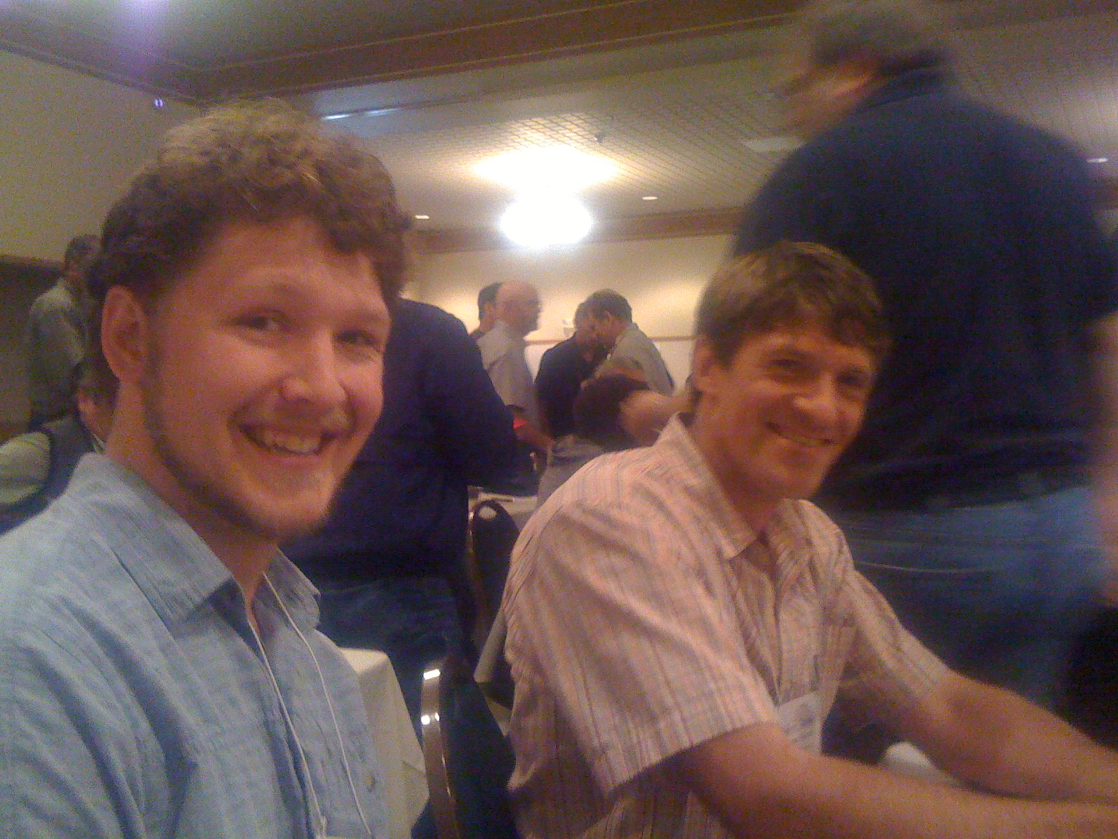 Above: Leif Rasmuson, a shellfish biologist with the Skokomish Tribe, and Adam, looking altogether too happy after the ocean acidification talk. Then today, hatchery managers from Oregon's Whiskey Creek oyster hatchery talked about their difficulties keeping oyster larvae alive. While the bacteria Vibrio tubiashii normally gets most of the credit for killing oyster larvae, managers at Whiskey Creek think the issue is more complicated, and that low pH in the ocean water is also a factor. Oyster larvae have softer shells than full-grown oysters, and are more susceptible to changes in pH. And yes, this is depressing. But never fear: lots of ridiculously fun things also happened at the conference, however, to protect the innocent, we'll keep them to ourselves.