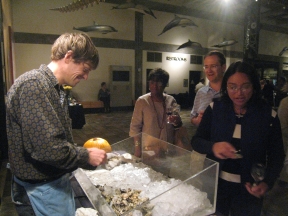 The event was held in the Monterey Bay Aquarium. We recommend that everyone make a pilgrimage to the Aquarium sometime soon. We particularly liked the Outer Bay exhibit-- and feel like our lives are richer now that we've discovered sunfish. As for the wines at the festival, we fell in love with the Alexander Valley cabernet from Silver Oak Cellars. Absolutely delicious, and way beyond our price range. We'd gotten up at 4 am Thursday to pack up the oysters and catch the plane, and it was a frigid morning, so we arrived in California wearing wool sweaters and stocking caps, and without sunglasses. Needless to say, the warmth and sunshine were welcome changes from the 40 degree rainstorm we'd left behind. We took advantage by turning the trip into a "workation," and went surfing in Santa Cruz and sightseeing along the coast before flying back to the top left.
