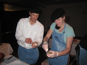 Last Friday the Hama Hama mobile shucking crew made a guest appearance at the French-American Chamber of Commerce's 15th annual Seattle Beaujolias Nouveau festival, held at the Lake Union Armory. We shucked 80 dozen oysters in a little under 3 hours, occasionally breaking free from the oyster booth to wander around and graze on all the other delicious food, including chocolate from the new Seattle chocolate store, Chocopolis, and bread from Boulangerie Nantaise.