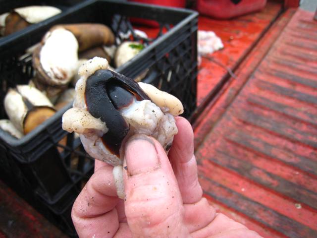 There are two parts to the video... first the octopus swims, and then he changes color. We're not sure, but we think this is a little red octopus. And that's not meant to be sarcastic. There are two species of octopus common in Puget Sound, the North Pacific Giant Octopus and the East Pacific Red Octopus. One way to tell them apart is to look for three eyelash-like papilla below the eyes, which are present in the little red but not in the giant. Unfortunately this octopus wasn't cooperative enough to let us look for eyelashes. But another arrow in our identification quiver is the fact that we hauled it up over the shallow tideflats, and red octopi are shallow-water creatures. Red octopi enjoy a diet of gastropods, bivalves, crabs, and barnacles. Humans occasionally enjoy a diet of octopi. Here's one of our crab suppliers, Ron, holding a tentacle from a giant octopus he pulled up from the depths on a crab pot.