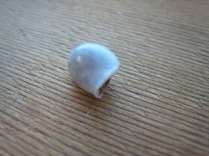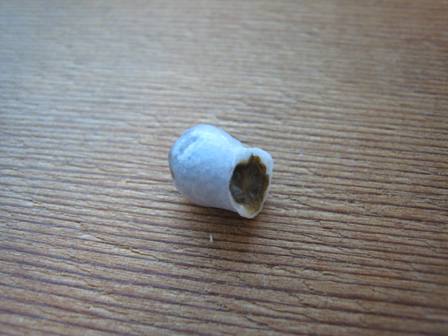 This thing came across the packing table today. Whatever it was, it must have gotten trapped inside an oyster and then covered with nacre. Diana suggests it might have been a barnacle... and despite the fact that barnacles are especially difficult sea creatures to relate to, the thought of being swallowed alive by an oyster and then slowly encased in shell is pretty creepy.