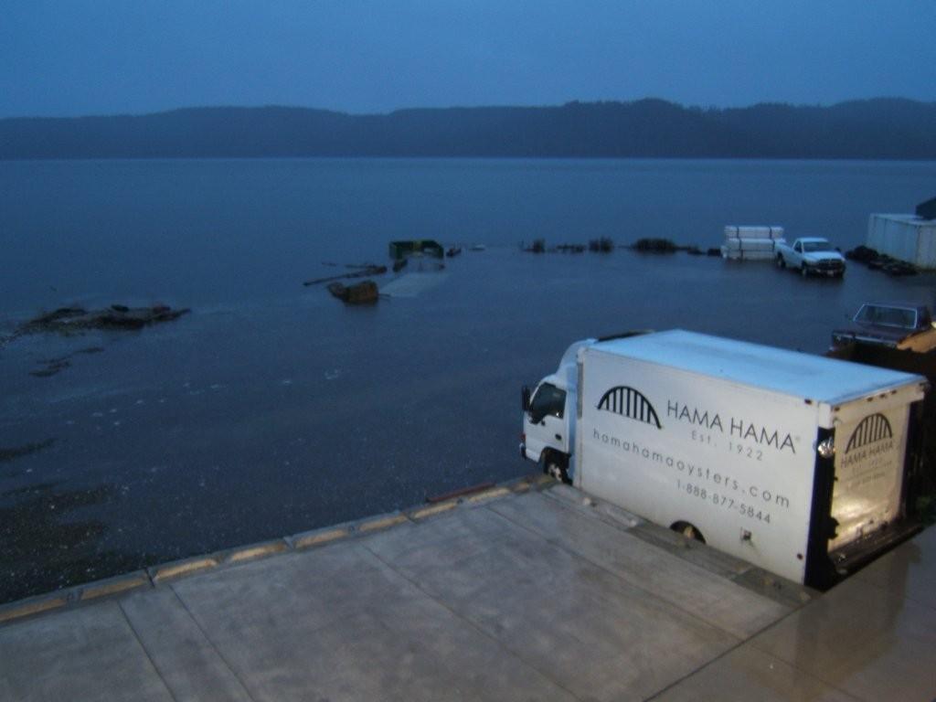 Here are the two images we used in our Christmas cards this year, followed by a picture of the high tide this morning. We ARE feeling a little swamped right now, but at least the delivery truck is high and dry. Happy Holidays everyone!