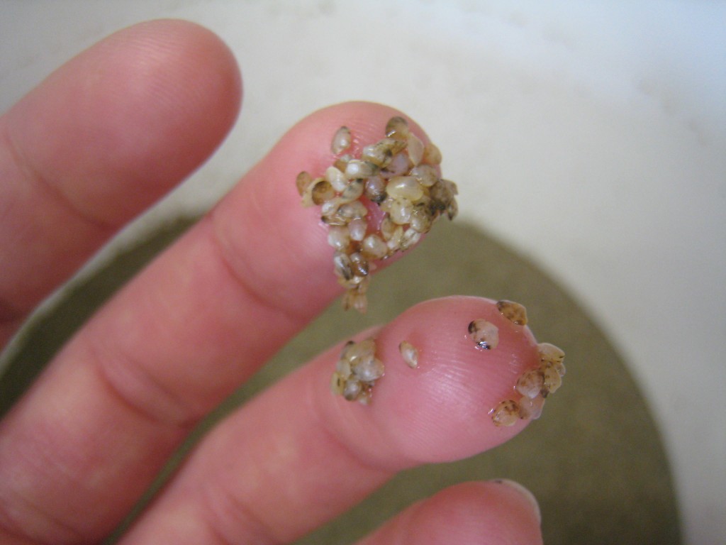 The Flupsy is a shellfish growing machine, and it's doing a great job fattening barnacles and mussels as well as oysters. On the photo day, Nick was busy scraping mussels off the intake screen, and separating barnacles (on right) from the oyster babies: