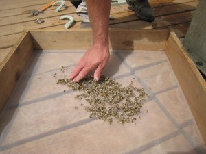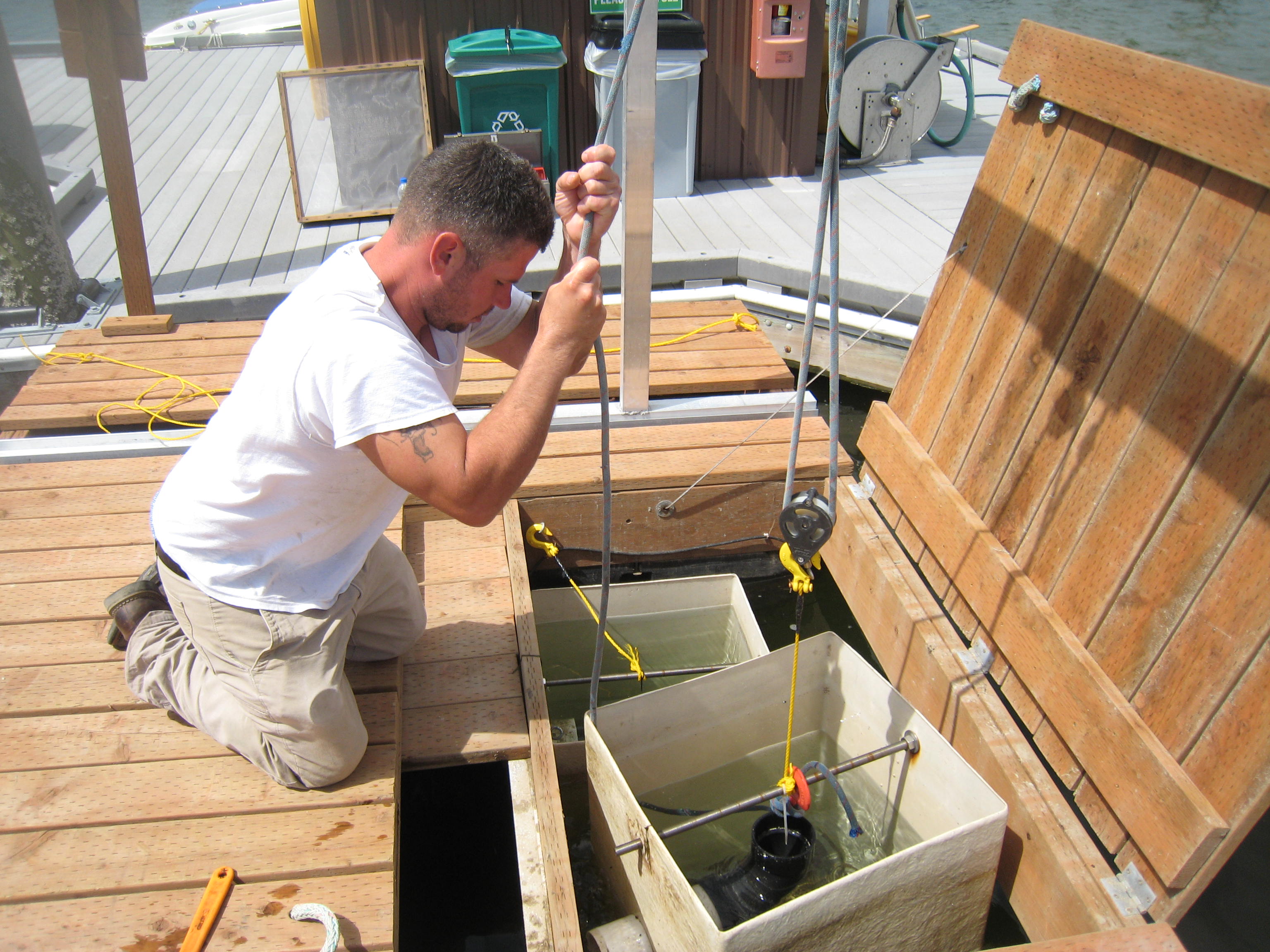If the seed is so small it'll float off, we put it in the Dupsy, where water flows down over the oysters, through a screen, and back to the Canal. Once the oysters are big enough to hold their own weight, they're moved to the Flupsy, where water flows up through the seed and back out to the Canal. The upwelling water floats the oysters slightly, allowing them to feed more easily, and so they grow faster in the Flupsy than in the Dupsy. The Dupsy (which we've moved outside since this picture was taken):