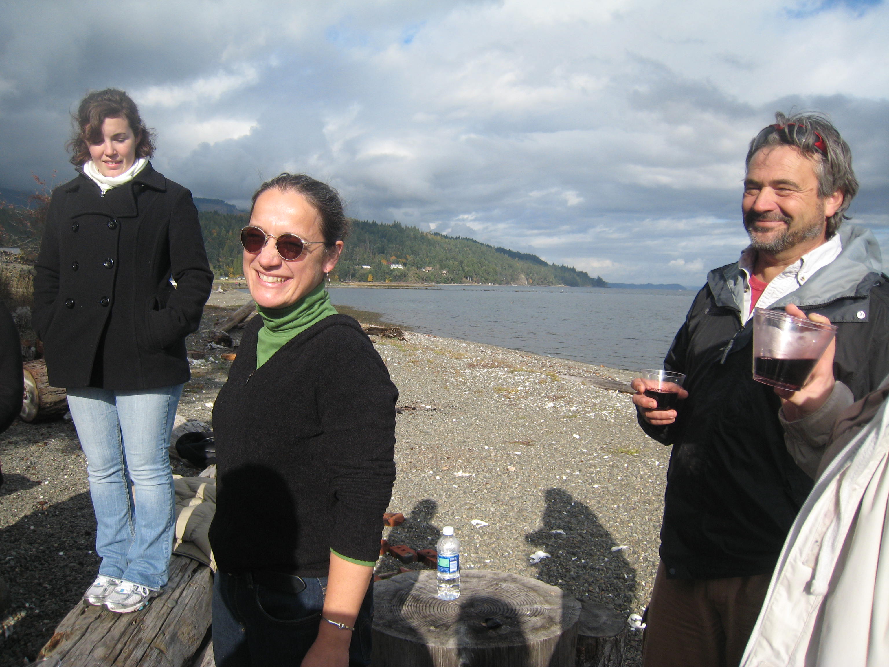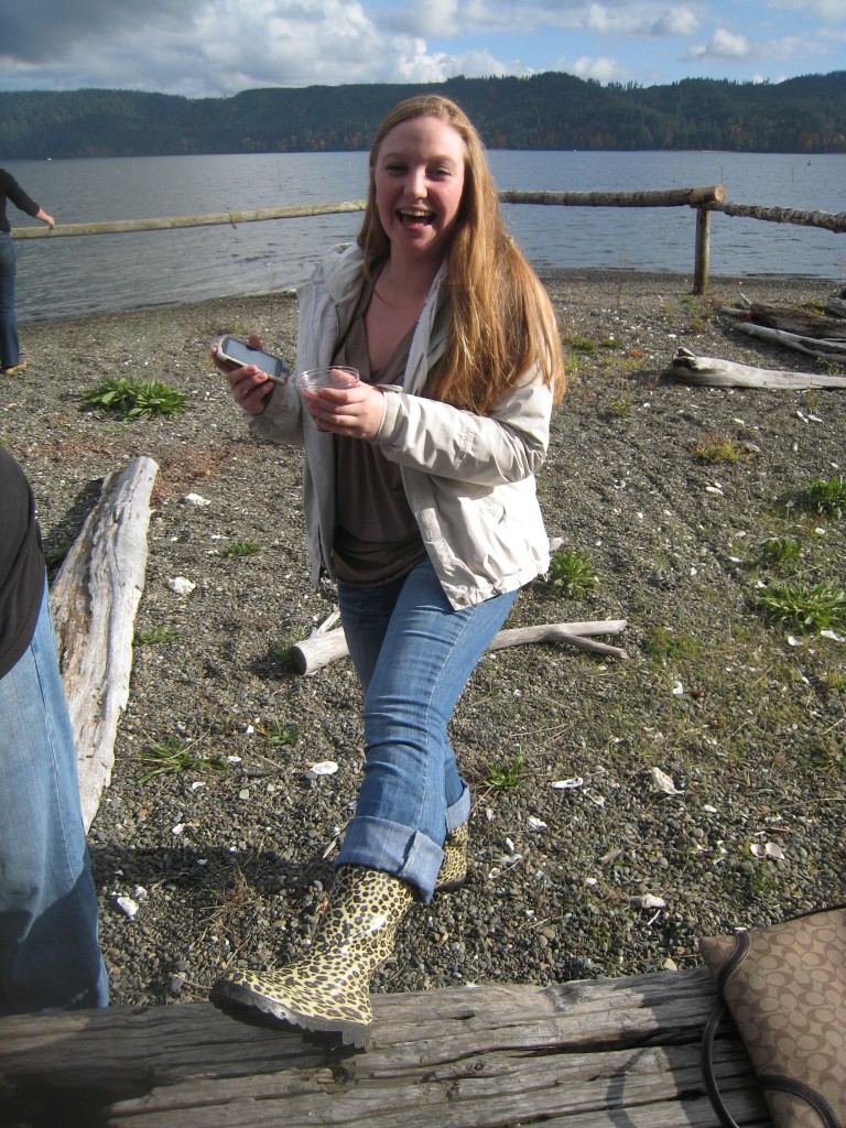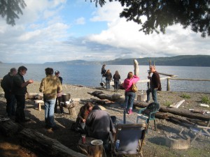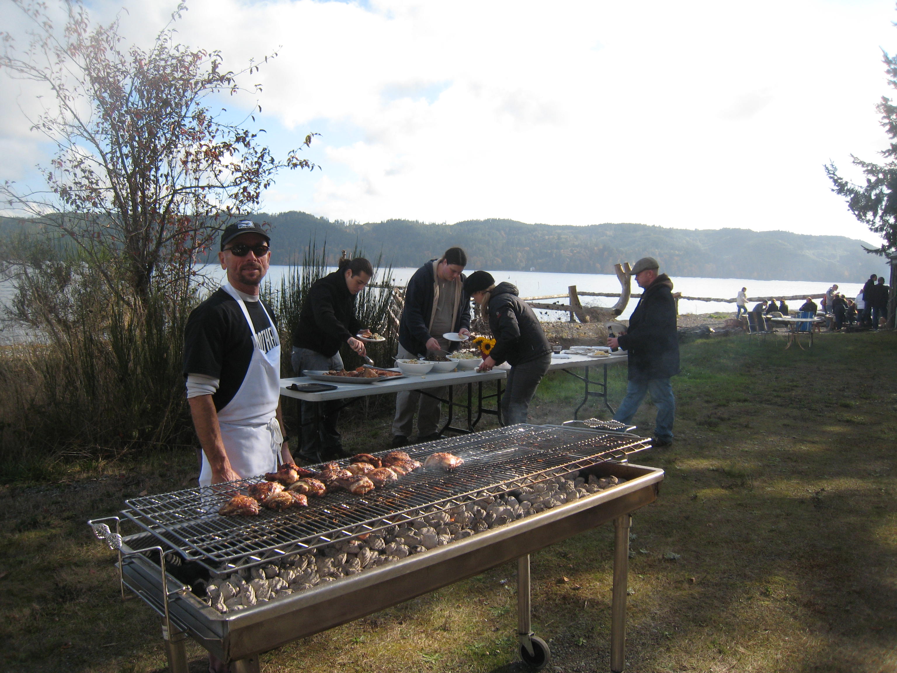 On Halloween the Culinary Institute of America stopped by for some delicious treats, and one unexpected trick. The school visits almost every year while on a culinary tour of the West Coast. They first meet up with wild salmon activist Amy Grondin and folks from Long Live the Kings to learn about salmon restoration, and then gather on our beach for raw oysters, barbecued oysters, and a delicious meal prepared by Seattle's Flying Fish restaurant. James Beard award winner Christine Keff, chef at the Flying Fish, is a pioneer in the sustainable seafood movement and cooks up a mean lunch.