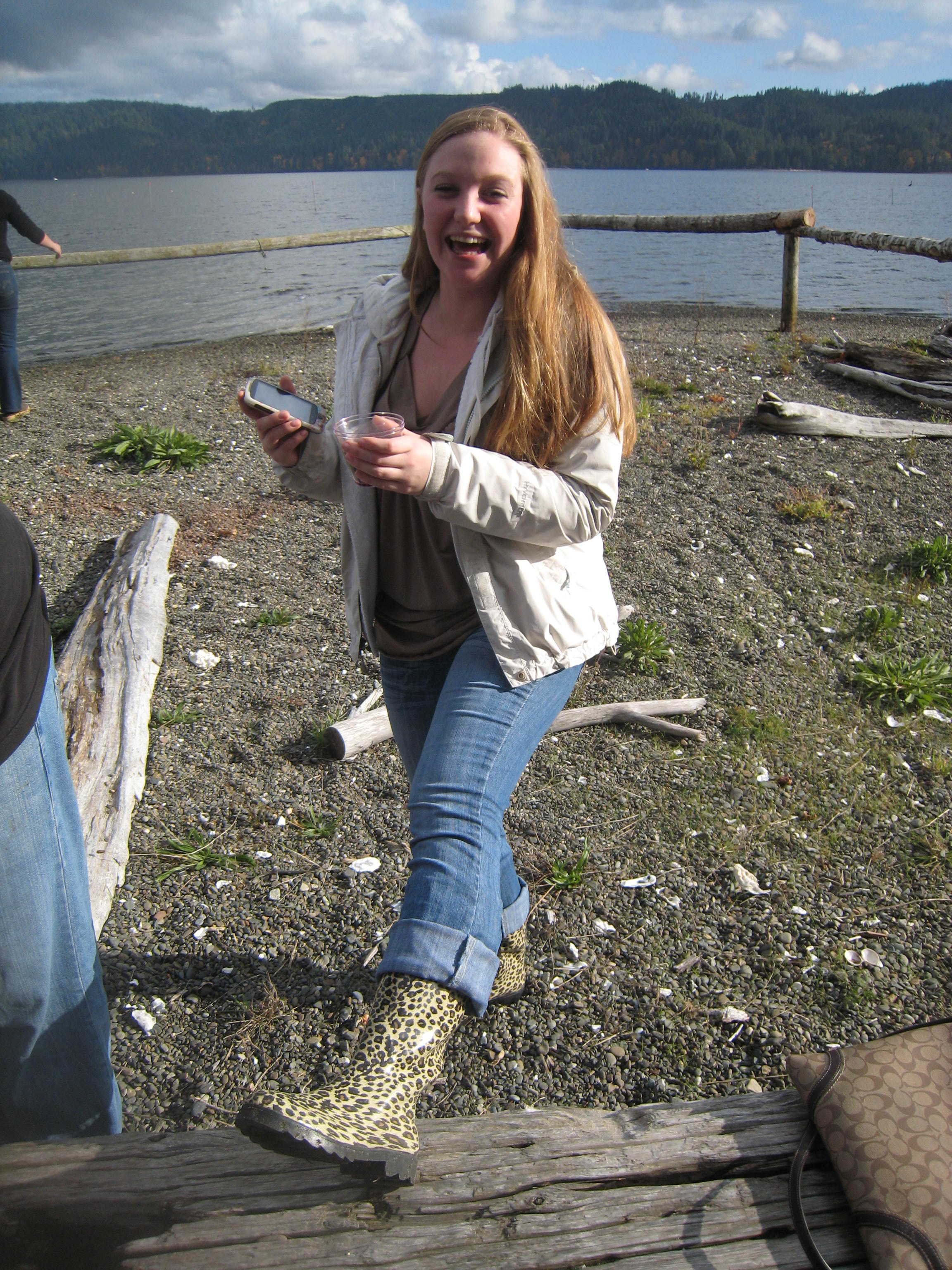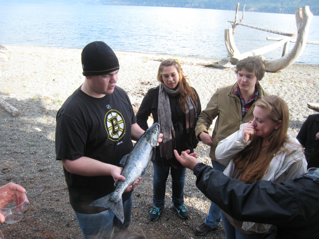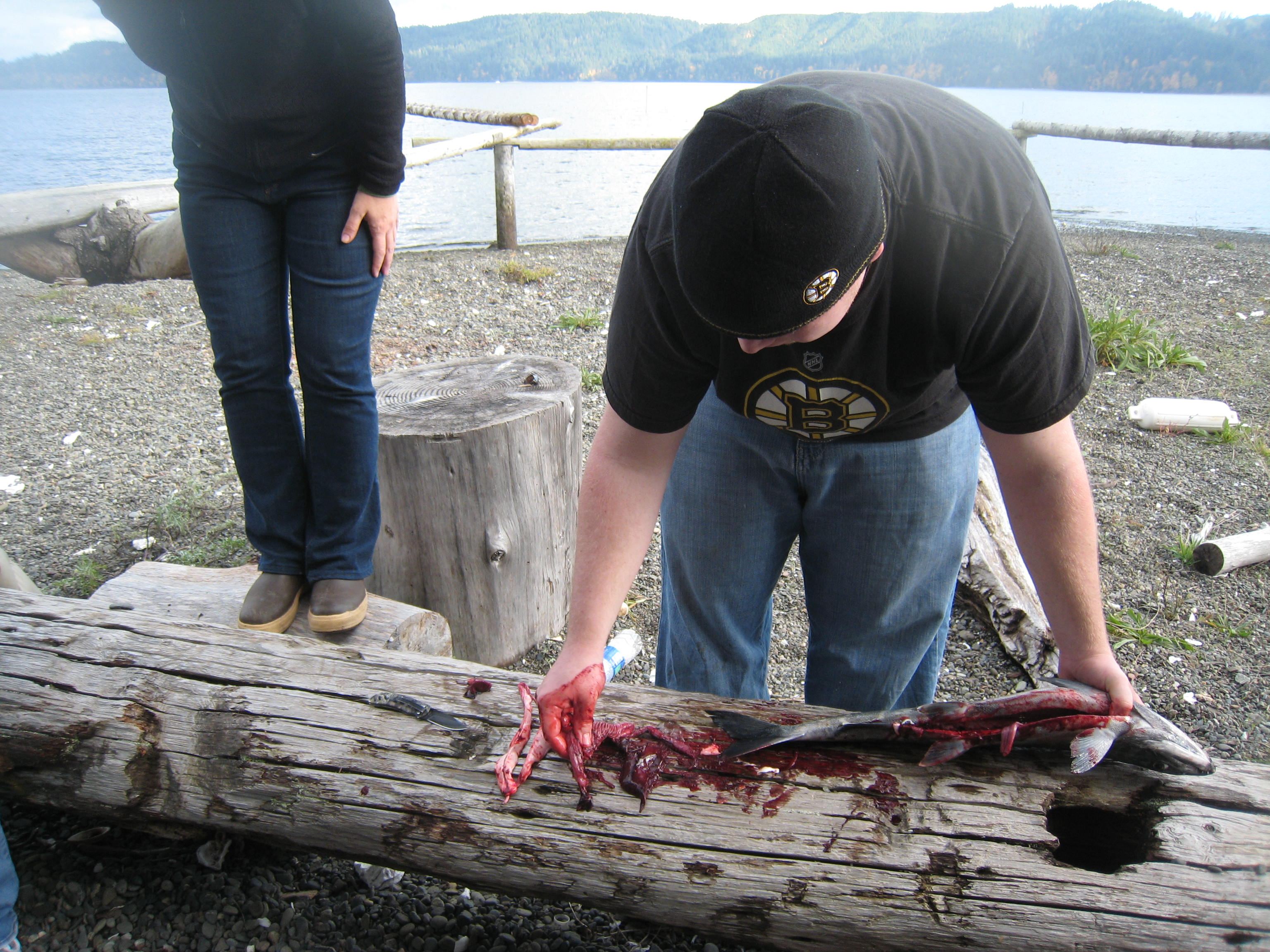 These boots might be made for walking, but they also catch salmon. One of the students cleaned the salmon pretty much with his bare hands. He laid the internal organs out for inspection. It felt very educational.