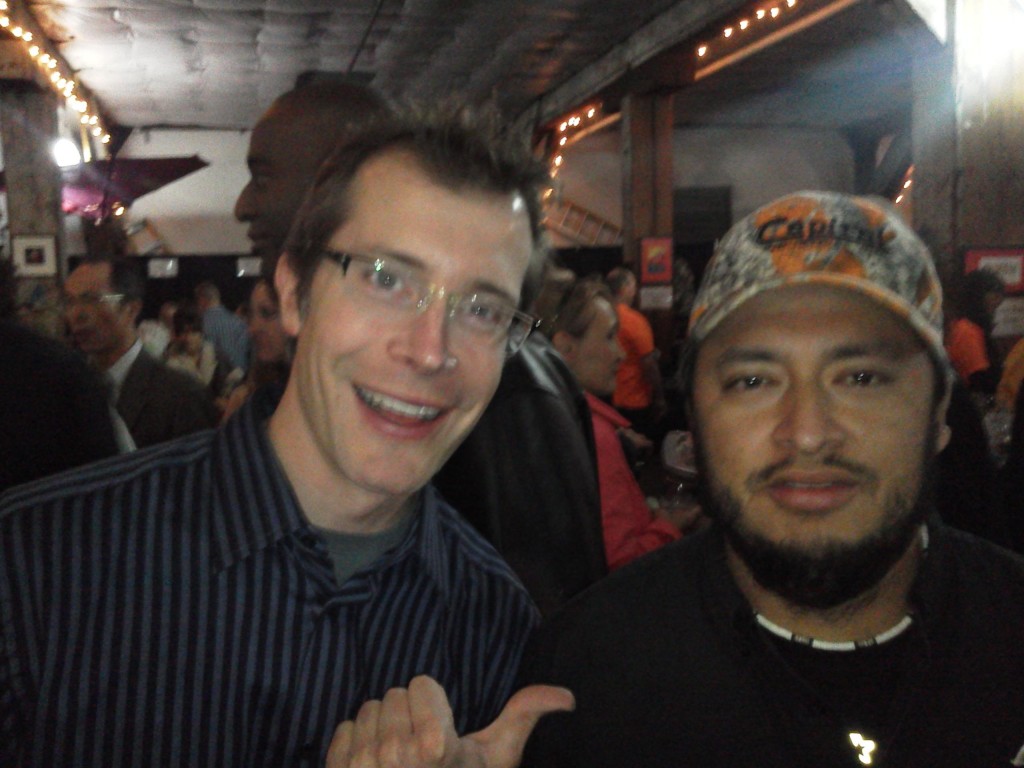 Longtime cluster shucker and now Hama Hama delivery guy Juan refuses to smile in photos. For a very happy guy, he takes a very serious photo. Here is he at Elliot's Oyster Frenzy, with Adam Gehrke, a local TV traffic reporter: