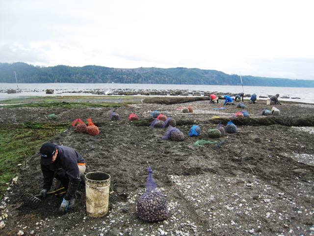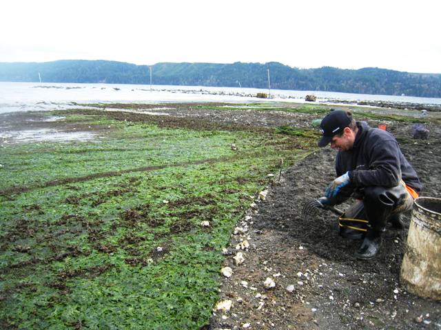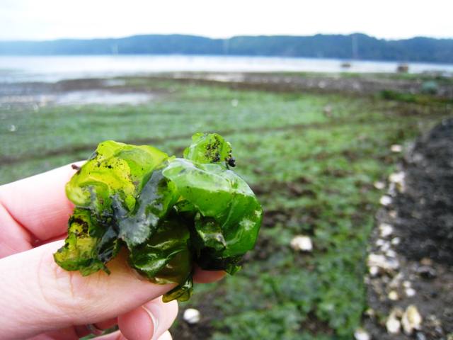 ... accidentally! We've had a few daylight low tides so far this year, and once the sunlight hits the flats the algae starts growing like crazy on our clam nets. Seaweed is algae. And, just in case you might need it, here's an idiot's guide to algae: there's microalgae, which is the kind that oysters eat, and macroalgae, which is the kind that we eat, like kelp, nori, etc. All seaweeds are edible in the sense that they're not toxic, but some are more delicious and digestible than others. Check out this guide to edible seaweed of the Pacific Northwest. Hold off hogging out on seaweed, however, if you're sensitive to iodine. Here we have some fucus, aka bladderwrack or popweed: