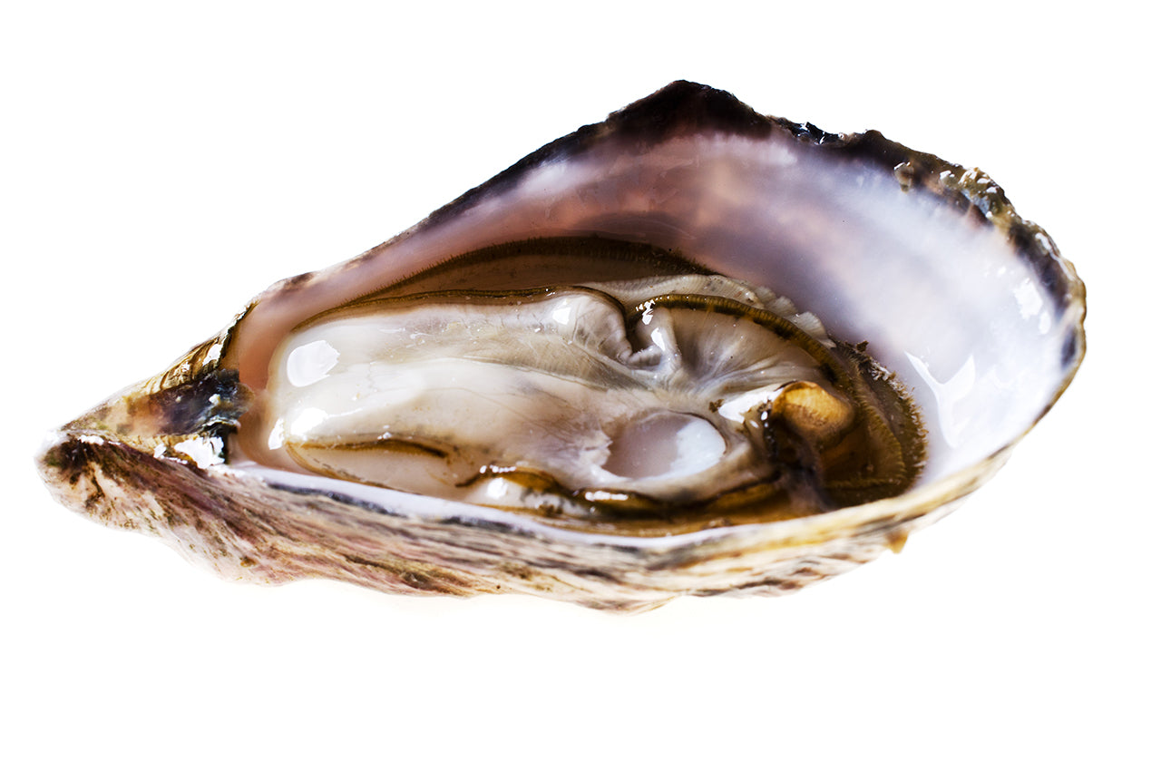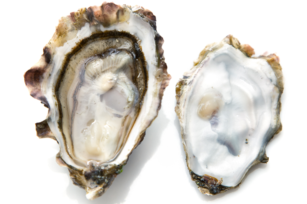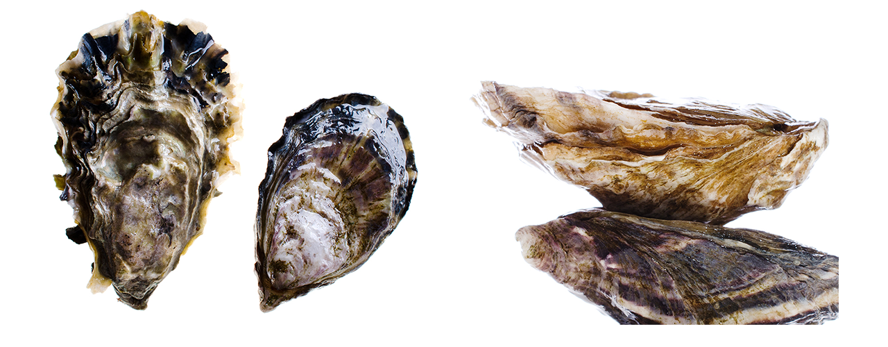 Oysters have a pointy hinge end and a cupped rounded edge. The hinge, or the umbo, is the only place where the two shells come together.