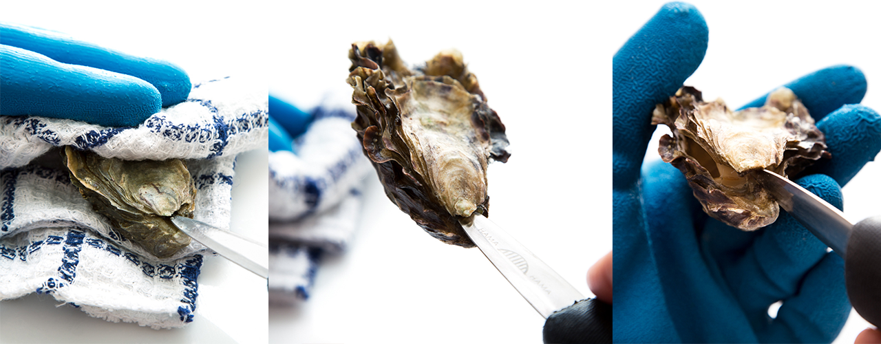 It's important to wear a glove on the hand holding the oyster, because even if the knife doesn't get you, the shell might. Wearing a glove on the hand holding the knife is up to you. Beware that you don't end up like us, though, with boxes and boxes of left handed gloves, and not a righty to be found.