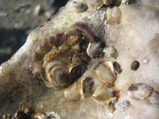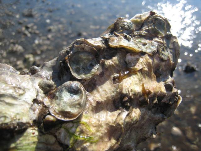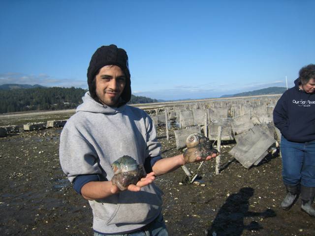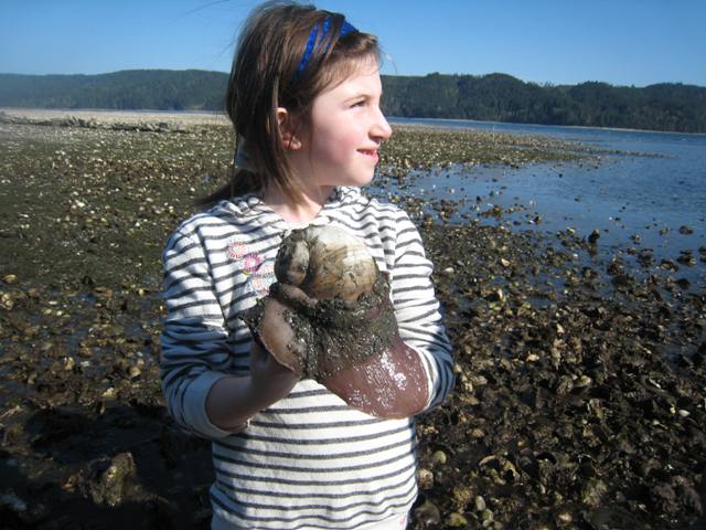 In the wet, deep areas we found wild olympia oysters clinging to pacific shells: