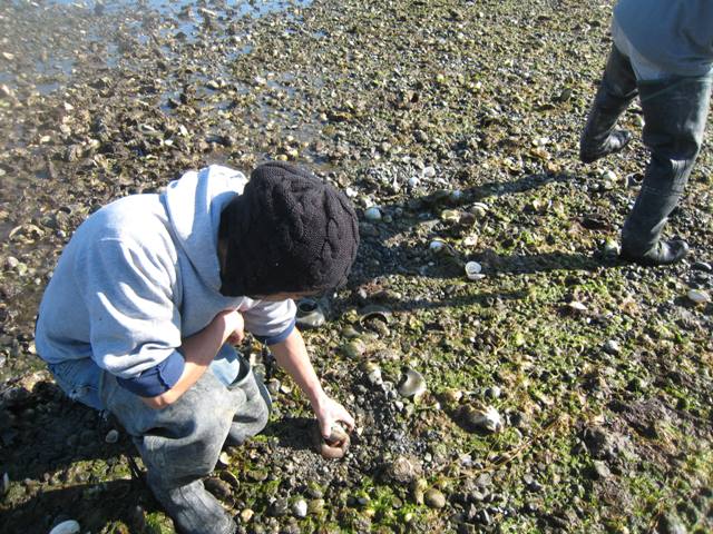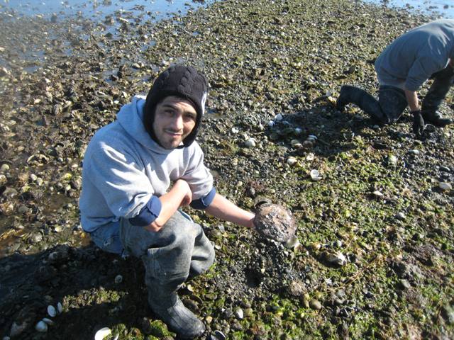 Moon snails are tricky critters, and they hide when the tide leaves. Here's Miguelito pulling one out of its hidey-hole: