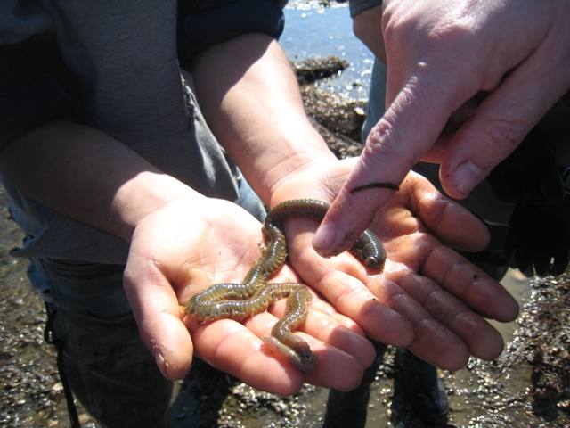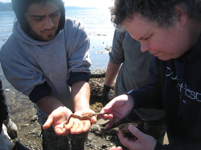 Last week Teri King from Washington Sea Grant came by to school us on sea creatures. We're getting geared up for our oyster rama and open farms, and wanted to re-familiarize ourselves with all the creepy crawlies. Our beach walk with Teri turned into an intertidal show-and-tell featuring colorful eggs, goopifying sea cucumbers, translucent clams, and boring sponges.... with the crew running around the beach finding things for Teri to identify, and Teri, in turn, asking the guys questions about what kinds of sea creatures they come across while working on the flats. Teri and Miguelito inspecting a sand worm: