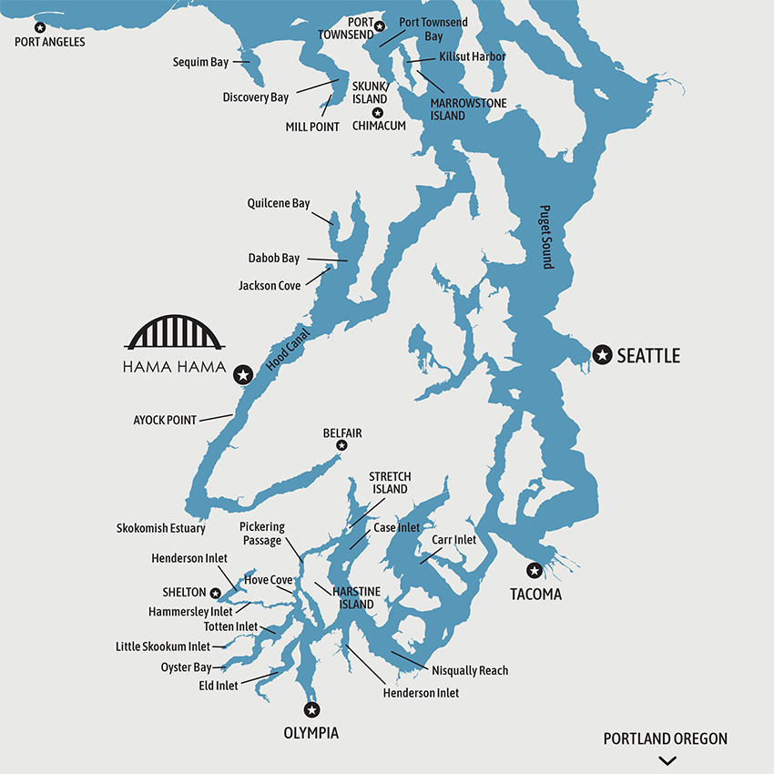 At any given point, our weekly Fresh Sheets offer 3 to 5 varieties of Pacific oysters, grown in various Puget Sound inlets using various culture methods. We name our oysters based on HOW and WHERE they're grown. Choose one variety if you know what you like, or mix and match if you'd like to offer a sample platter.