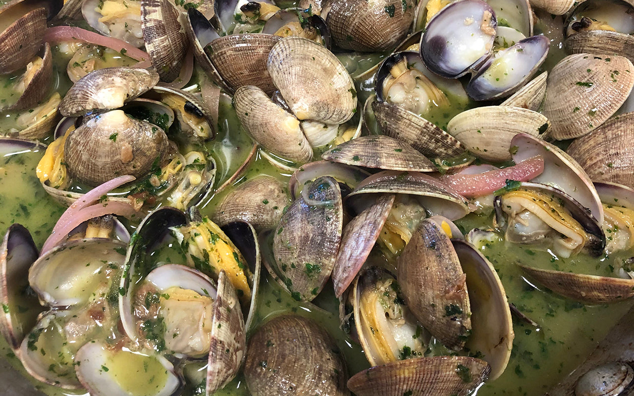 If you're cooking with purple savory clams, keep in mind that they flash open before they're fully cooked, whereas with a manila clam, opening up is generally a sign that it's cooked thoroughly.