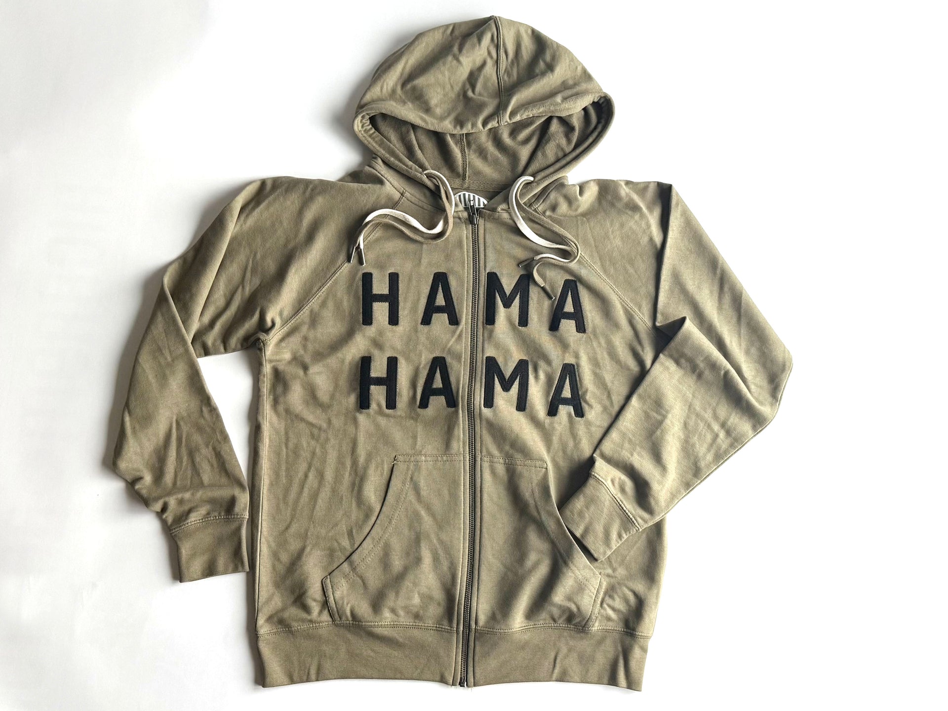 A lightweight zip hoodie with HAMA HAMA (or HAHA MAMA depending on how you slice it) in black appliquéd lettering. The ideal weight for cool summer nights, autumn bonfires, or layering in colder weather.