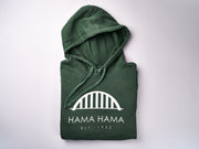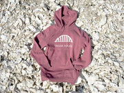 This is a midweight pigment-dyed pullover hoodie with a white bridge logo.