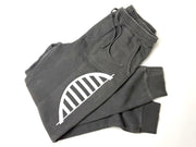 Gray pigment-dyed drawstring sweatpants with the bridge on the left leg.