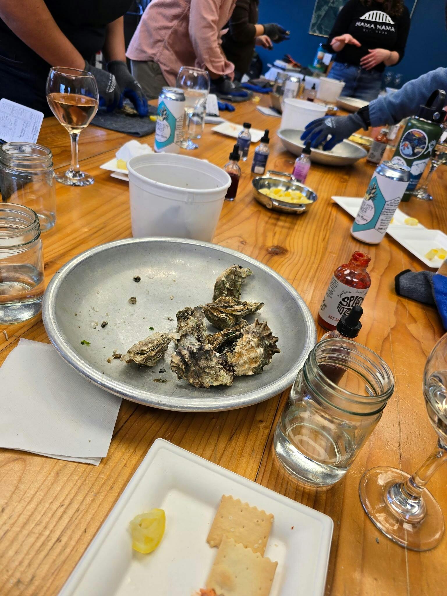 Class starts at 12 and ends between 2 and 3 pm. You'll eat ~2 dozen oysters (depending on how many you're hungry for!) and sample at least 4-6 different types (including some of our roasted oysters).