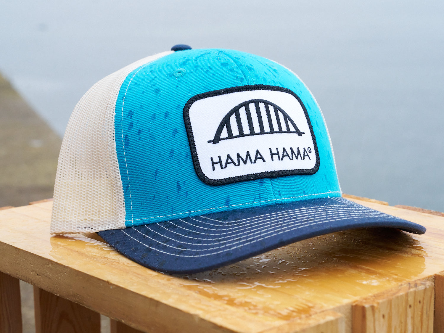 Trucker hats with embroidered black-and-white Hama Hama bridge logo patches (rain not included).
